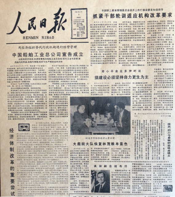 “改革開放是決定當(dāng)代中國(guó)命運(yùn)的關(guān)鍵一招。”1982年5月7日《人民日?qǐng)?bào)》頭版刊載文章:“用經(jīng)濟(jì)組織替代行政機(jī)構(gòu)進(jìn)行經(jīng)營(yíng)管理——中國(guó)船舶工業(yè)總公司宣布成立”,標(biāo)題下文又著重強(qiáng)調(diào)“以提高經(jīng)濟(jì)效益,加速我國(guó)船舶工業(yè)為目標(biāo),實(shí)行工業(yè)與貿(mào)易,軍用品與民用品,造船與修船,科研與生產(chǎn)相結(jié)合的方針”。頭版還發(fā)表了以“經(jīng)濟(jì)體制改革的重要嘗試”為標(biāo)題的“社論”。在這期《人民日?qǐng)?bào)》的頭版還刊發(fā)了鄧小平同志接待外賓時(shí)的講話“搞建設(shè),必須堅(jiān)持自力更生為主”。