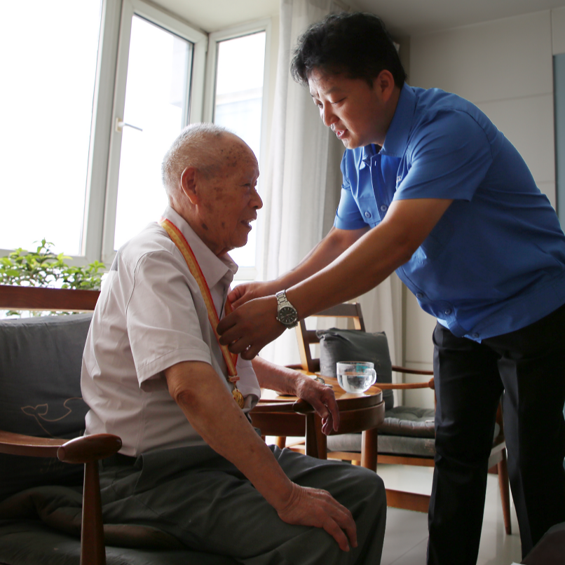 在紀念中國人民抗日戰爭暨世界反法西斯戰爭勝利80周年之際,中國船舶集團有限公司黨組副書記、董事賈海英走訪慰問抗戰老兵焦英杰,頒發“中國人民抗日戰爭勝利80周年”紀念章,并代表集團公司黨組向他致以崇高敬意和誠摯問候。