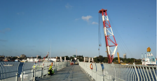日前,中國(guó)船舶集團(tuán)旗下中船應(yīng)急承建的肯尼亞蒙巴薩人行浮橋正式建成通行。蒙巴薩作為肯尼亞第二大城市,是全國(guó)重要工商業(yè)中心,其港口為非洲東海岸最大海港。浮橋的建成,使蒙巴薩主島和周邊地區(qū)兩岸居民通行時(shí)間由原來(lái)的45分鐘縮短至10分鐘,極大方便了當(dāng)?shù)鼐用癯鲂小M瑫r(shí),浮橋通航孔的設(shè)計(jì)可滿足萬(wàn)噸大型船舶暢通進(jìn)出蒙巴薩港口。