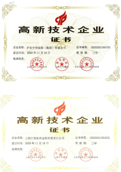 日前,中國船舶集團旗下滬東中華及其控股公司上海江南長興造船有限責任公司雙雙收到了由上海市科學技術委員會、上海市財政局、國家稅務總局上海市稅務局聯合頒發的高新技術企業證書。