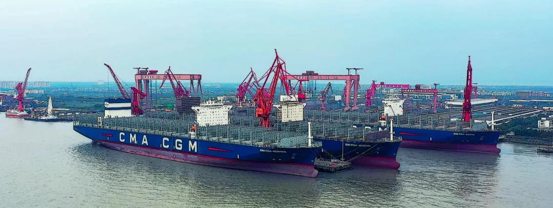“海上綠巨人”系列箱船是滬東中華近期的重點(diǎn)產(chǎn)品。三艘15000TEU集裝箱船列隊(duì)整齊,滬東中華建造團(tuán)隊(duì)開(kāi)足馬力,奮戰(zhàn)金秋。該型號(hào)集裝箱船是當(dāng)今世界綠色環(huán)保船型,國(guó)產(chǎn)化率達(dá)到90%,可靈活布置于全球各個(gè)重要航線。