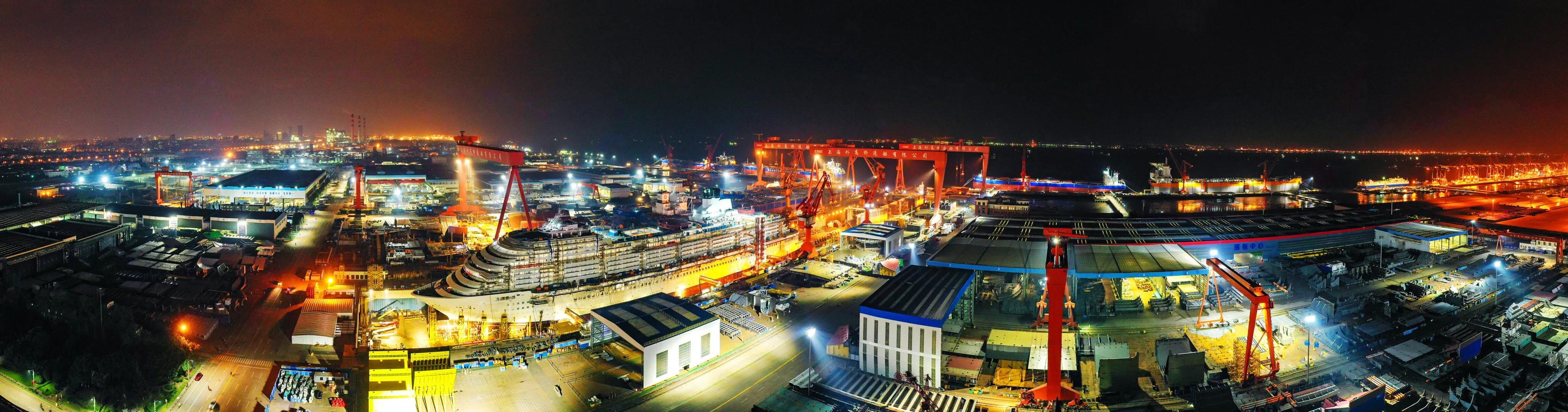 十月金秋結(jié)碩果,外高橋造船提前兩個(gè)半月完成了2021年度交船19艘/座的生產(chǎn)任務(wù),燈火通明的廠區(qū)超廣角視圖充分體現(xiàn)了外高橋造船人持續(xù)保障大型郵輪項(xiàng)目高效運(yùn)行,努力完成民船、海工、郵輪產(chǎn)品的設(shè)計(jì)建造任務(wù)、爭(zhēng)取以超額完成全年目標(biāo)的決心和信心。