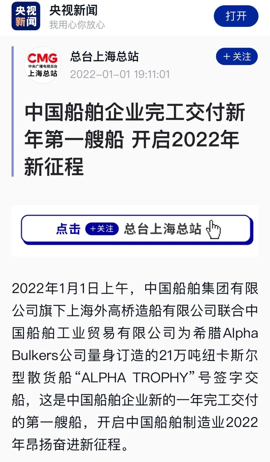 1月1日上午,中國船舶集團旗下外高橋造船聯合中船貿易建造的21萬噸紐卡斯爾型散貨船“ALPHA TROPHY”號簽字交船,這是中國船舶企業新的一年完工交付的第一艘船,開啟中國船舶制造業2022年昂揚奮進新征程。