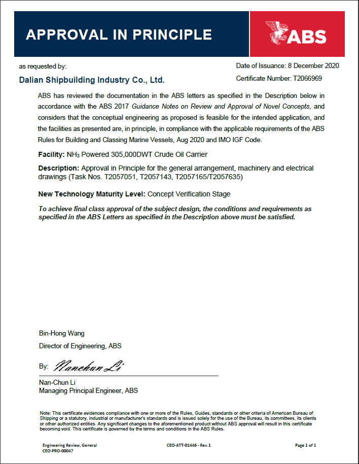 2020年,大船集團研發的液氨動力超大型油船(VLCC)分別取得美國船級社(ABS)和中國船級社(CCS)頒發的AIP證書。