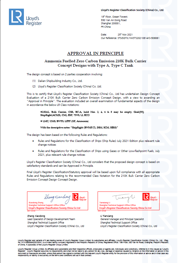 2月25日,中國船舶集團旗下大船集團最新研發的液氨動力21萬噸散貨船設計方案,獲英國勞氏船級社(LR)原則性認可(AIP)證書。