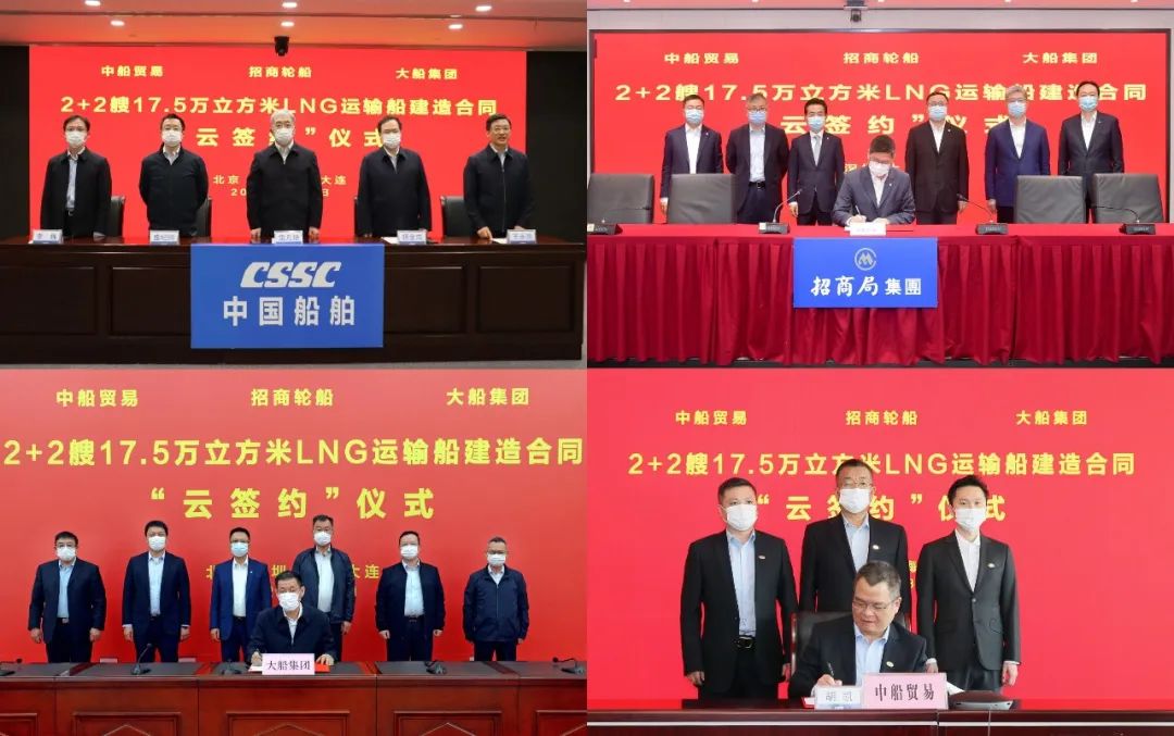 3月31日,中國船舶集團有限公司旗下大船集團聯合中船貿易與招商局集團有限公司旗下招商輪船在上海、深圳、大連及北京四地以“云簽約”方式簽署2+2艘17.5萬立方米大型液化天然氣(LNG)運輸船建造合同。中國船舶集團黨組書記、董事長雷凡培,黨組副書記、總經理楊金成,黨組成員、副總經理盛紀綱,招商局集團董事長繆建民、總經理胡建華、董事王宏出席簽約儀式。雷凡培、繆建民在儀式上致辭。