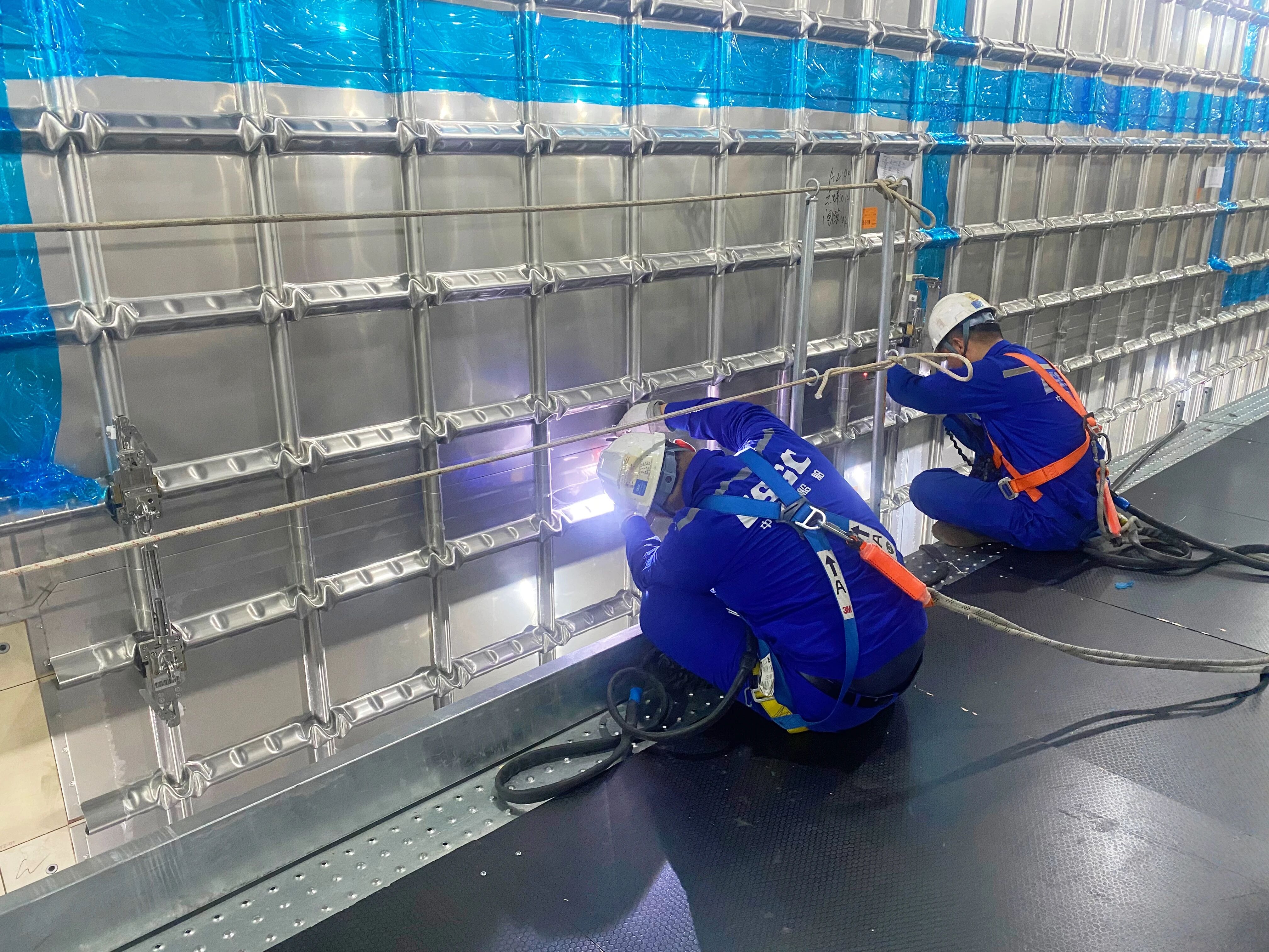 在大連,工程公司一工廠船體作業區產能同比提升30%;LNG項目組成功解決了薄板焊接變形、焊縫成形不均等技術瓶頸,并順利交付兩個液貨艙的貨圍階段氨氣試驗施工任務,質量檢測結果超行業第一梯隊平均水平。