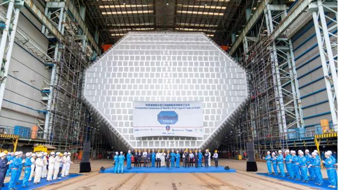 VLEC建造團隊在船東、配套廠商和船級社等各方密切配合下,共同克服新冠肺炎疫情等不利因素,攻克B型液貨艙核心關(guān)鍵技術(shù)難點,注重項目管理導(dǎo)向、革新工藝工法、鎳鋼焊接程序、薄板變形控制和優(yōu)化建造流程。從2019年12月底合同簽約到今天首制船的完工交付,總建造周期24個月,碼頭舾裝周期4個月,均開創(chuàng)了江南造船大型液化氣船首制船最短周期紀(jì)錄,實現(xiàn)了復(fù)雜船型節(jié)拍化建造。