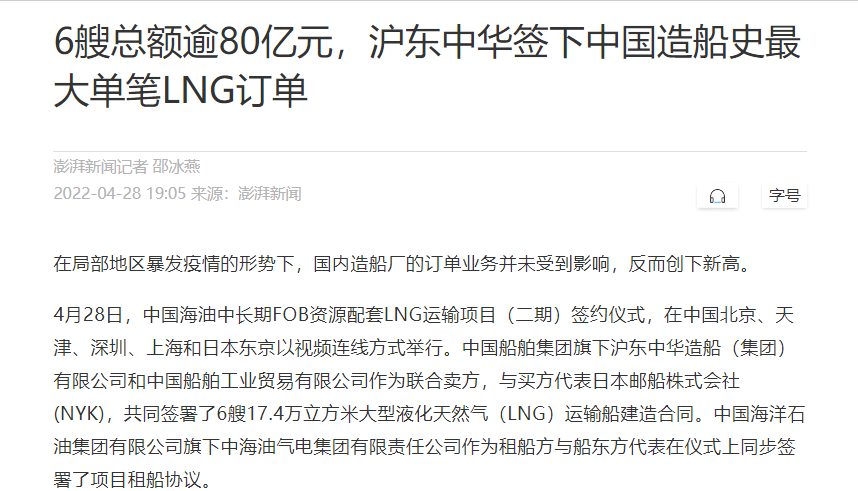 這次簽約生效的6艘LNG船總金額達80余億元人民幣,再次刷新了今年年初創造的LNG船一次性合同金額最大訂單紀錄。至此,今年前4個月滬東中華已累計承接LNG船訂單達到創歷史紀錄的17艘,超越韓國船企傲居全球之首,在實現簽單質量和數量“雙提升”的同時,進一步鞏固了滬東中華在中國LNG產業鏈的龍頭地位和領跑優勢。