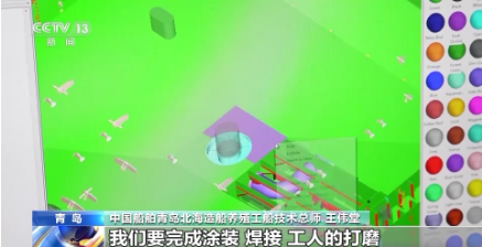 中國船舶青島北海造船養殖工船技術總師 王偉堂:魚排是第一次用在船舶上,整個魚排空間比較小,首先考慮就是怎么來裝。在很小的空間內,我們要完成涂裝、焊接、工人的打磨,還有系統調試。我們前期跟設計院做了深入的探討,尋求了一個最佳的方案,就形成了目前這個狀態。