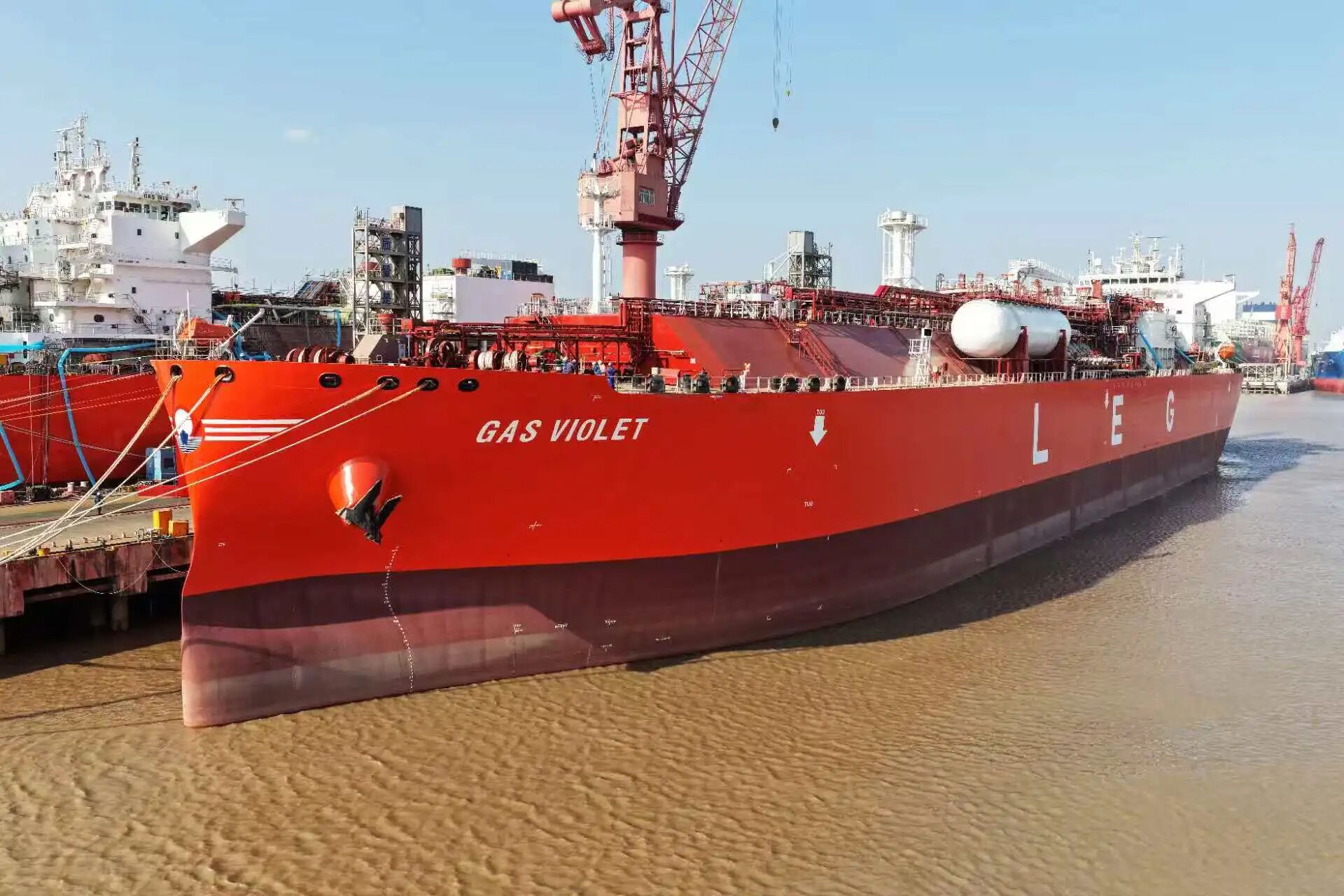 兩船建造過程中,江南造船建造團隊勇于創(chuàng)新、直面困難與挑戰(zhàn)?!癎AS PEONY”號以船塢和碼頭共178天的建造周期再一次刷新紀錄;“GAS VIOLET”號碼頭建造周期較前船縮短15天,總體效率提升35%。